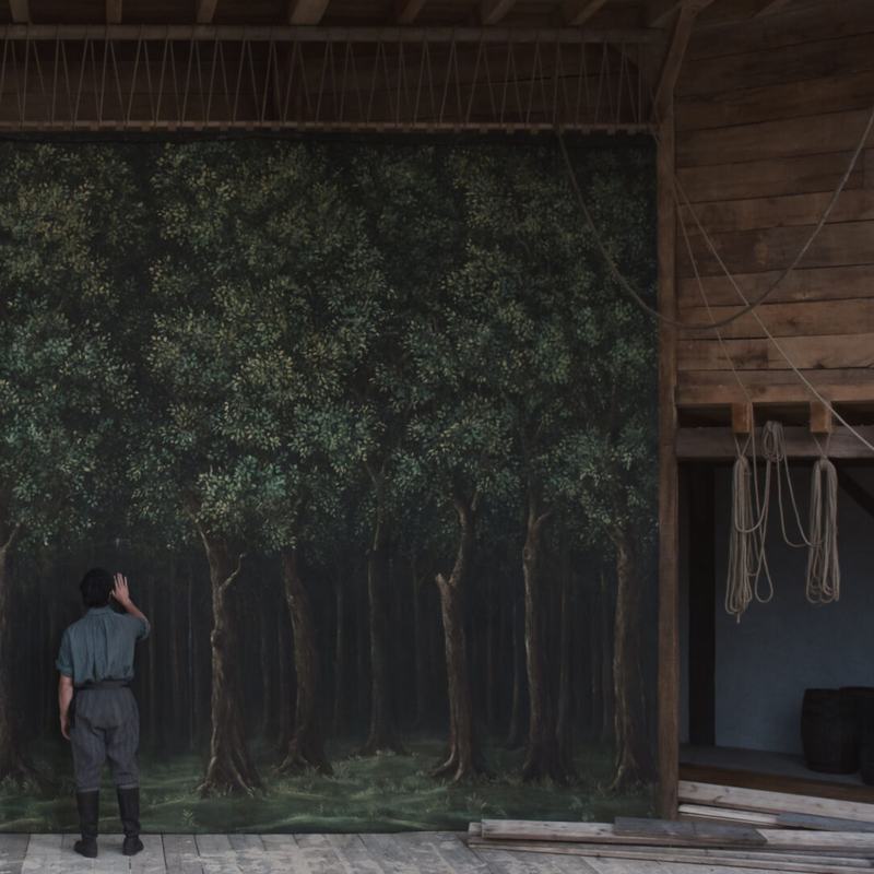 It also needed to feel linked to the aesthetic of the story that we've been telling and the forest, particularly. That was Chloe's direction to me. She said, I want it to feel like the inside of a tree. The idea of the circular looking up to the sky through a circle, we were always going to honor the shape of the globe and the exterior, the look of the exterior. When it came to the interior, the significant deviation is that we put the painted backdrop onto the stage, which our understanding is that that was something that was starting in Italy at the time, but would not have been in the UK or in England.