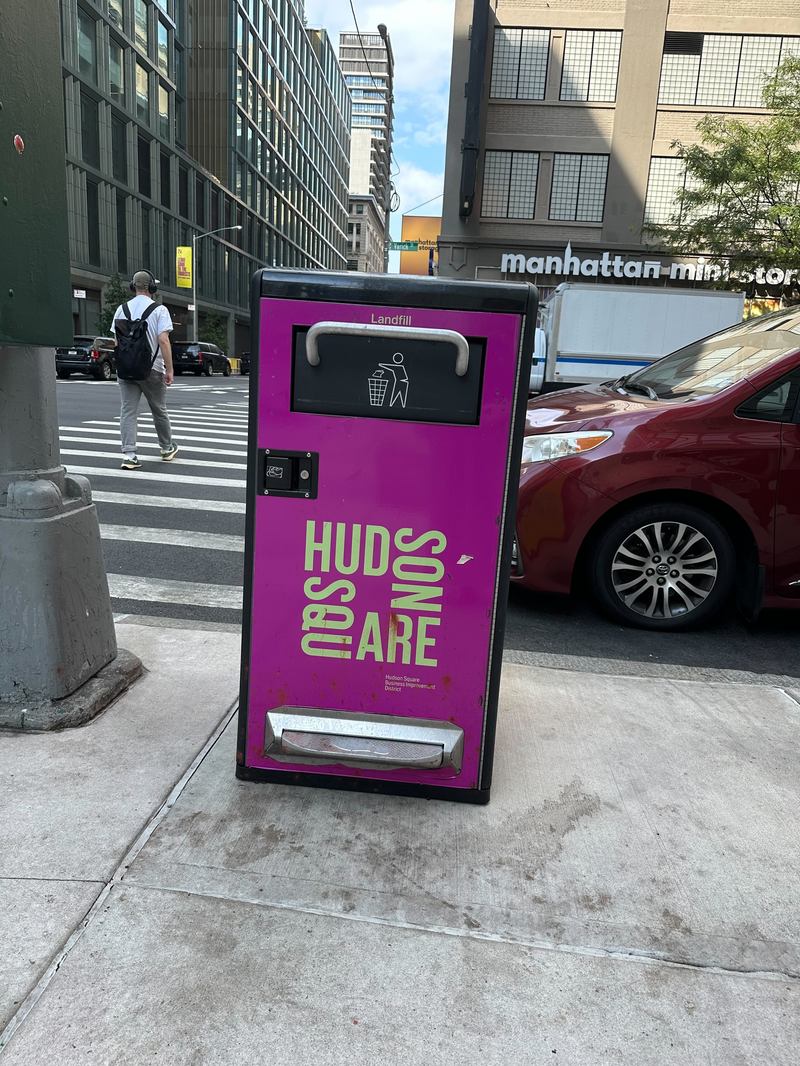 David: Normally, when Alison Stewart kicks off the show, she says we are live from the WNYC Studios in SoHo. That's because WNYC is on Varick Street, a couple of blocks South of Houston, a couple of blocks North of Canal. Recently, we received a letter saying we are mischaracterizing our neighborhood. "Attached is a photo of the trash bin in front of the green space," says the listener. That's the green space, our performance space down on the ground floor of our building. The trash bin says Hudson Square.
