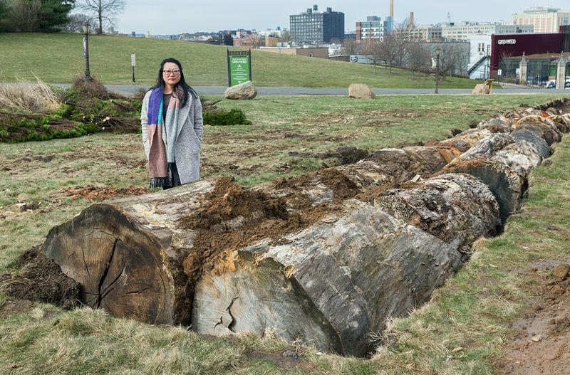 Jean Shin standing with her Green-Wood cemetery installation 'Offering"