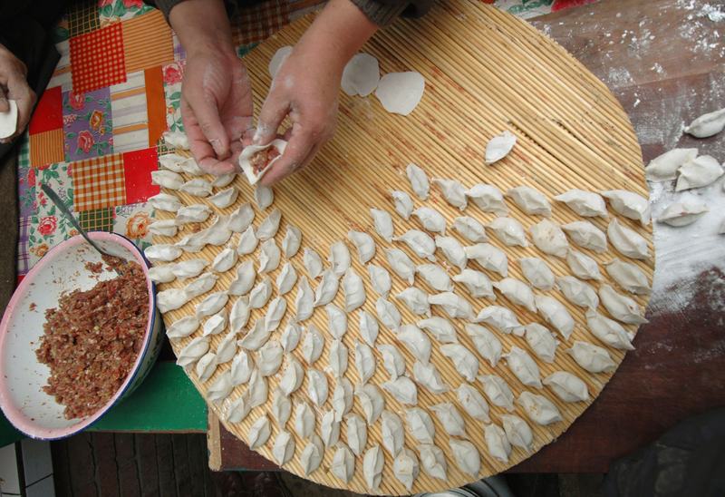 A resident makes Chinese dumplings on Chinese New Year's Eve February 8, 2005 in Fu County, Shaanxi Province, China. Making dumplings, which symbolize the reunion of the entire family, is one of the
