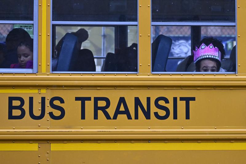 Children arrive in a school bus to attend El Museo's 48th Annual Three Kings Day Parade in the East Harlem neighborhood of New York City on January 6, 2025.