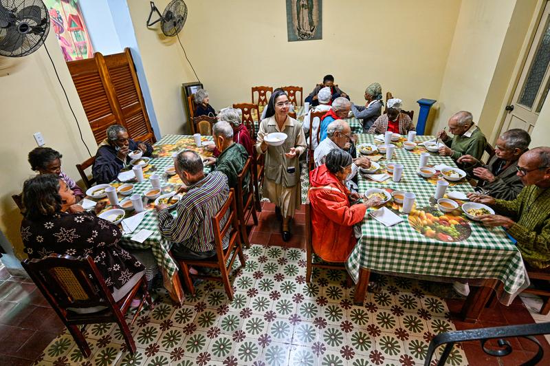 Sister Gertrudis distributes food to elderly people at a senior dining hall run by the Catholic Church in the Guanabacoa neighborhood of Havana on February 4, 2026.