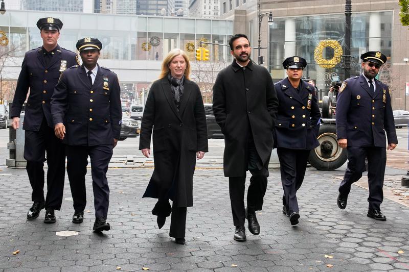Mayor-elect Zohran Mamdani, center, right, and New York City Police Commissioner Jessica Tisch, center left, walk to the New York City Police Memorial, on November 19, 2025.