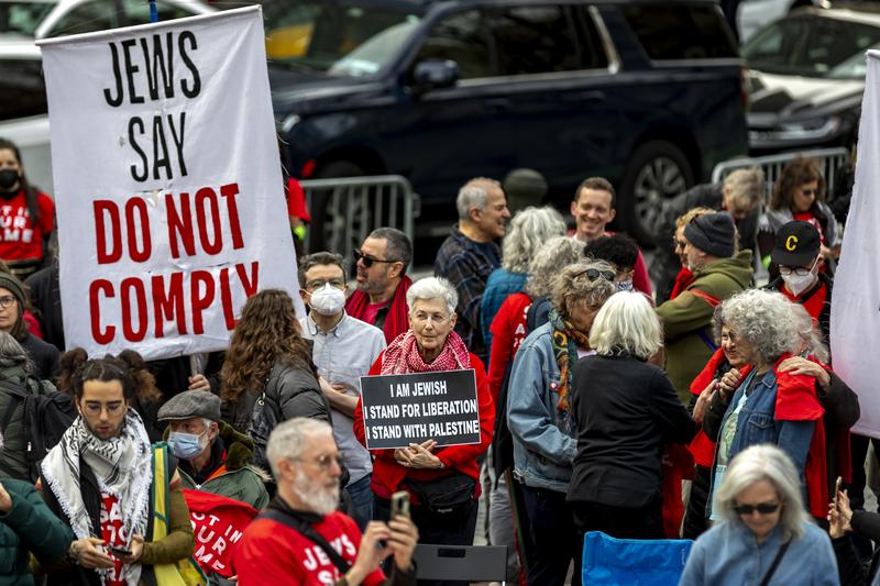 Jewish activists and allies take part in a Passover Seder outside ICE headquarters in New York City to demand the release of Mahmoud Khalil and an end to the war on Gaza, Apr. 14, 2025..
