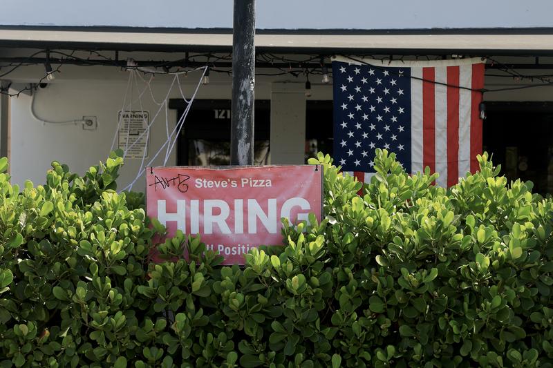 A 'Hiring' sign is posted outside of Steve's Pizza restaurant on October 03, 2025 in Miami, Florida.
