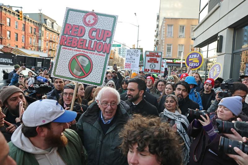 New York City Mayor-elect Zohran Mamdani (R) and US Senator Bernie Sanders (C) join striking Starbucks workers in New York on December 1, 2025.