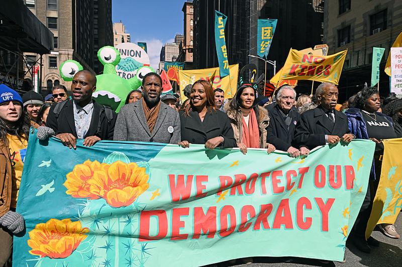 Protestors, Public Advocate Jumaane D. Williams, New York Attorney General Letitia James, Padma Lakshmi, Robert DeNiro and Rev. Al Sharpton are seen at the "No Kings" March on March 28, 2026 in NYC.