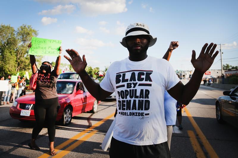 Demonstrators protest the killing of teenager Michael Brown on August 12, 2014 in Ferguson, Missouri.