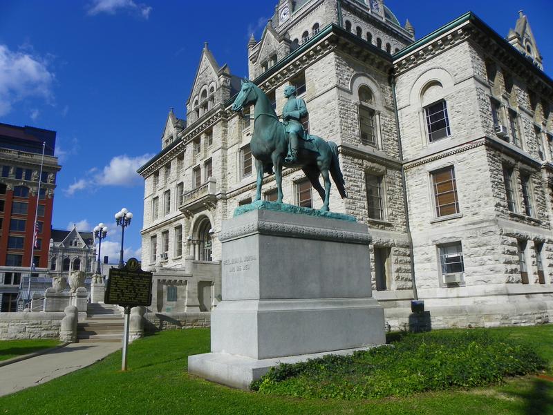 A statue of John Hunt Morgan, a Confederate general, sits outside the former Fayette County courthouse in Lexington, Kentucky