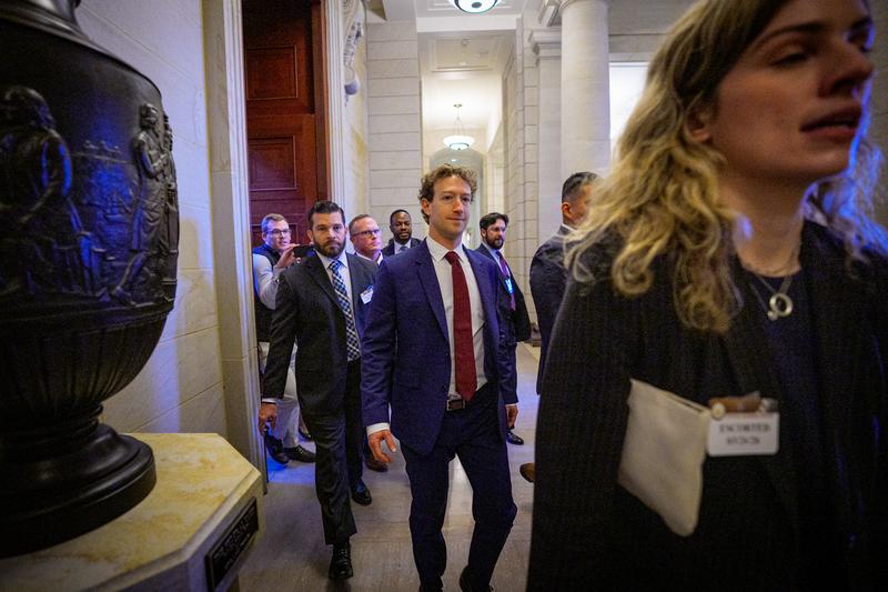 Meta Platforms Chief Executive Mark Zuckerberg (C) departs a meeting with Senate Majority Leader John Thune (R-SD) on Capitol Hill on March 26, 2026 in Washington, DC.