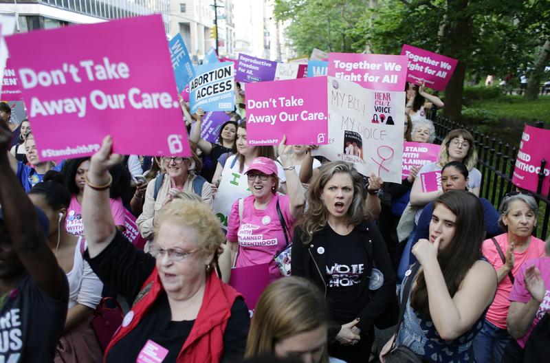 Supporters of Planned Parenthood react to speakers at a rally, Thursday, May 24, 2018, in New York.