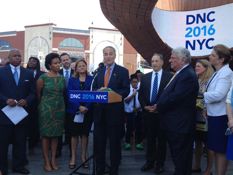 US Sen. Schumer leads a presser outside the Barclays Center with