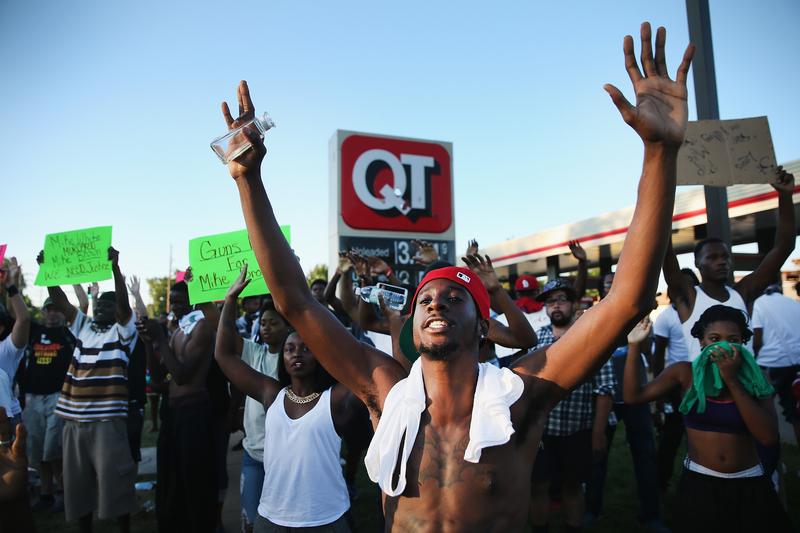 Demonstrators protest the killing of teenager Michael Brown on August 12, 2014 in Ferguson, Missouri.