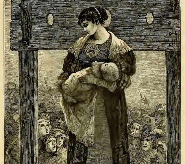 Hester Prynne at the Stocks - an engraved illustration from an 1878 edition of The Scarlet Letter