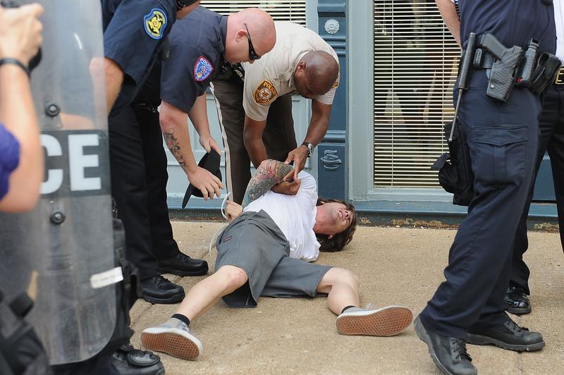 A man is arrested during a protest of the shooting death of 18-year-old Michael Brown outside Ferguson Police Department Headquarters August 11, 2014 in Ferguson, Missouri.
