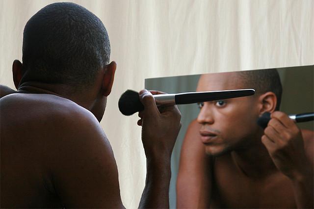 Male subject applies makeup in mirror