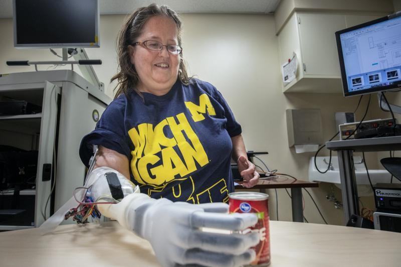 Karen Sussex, a participant in the University of Michigan RPNI study, naturally uses her mind to control a Touch Bionics i-LIMB prosthetic hand to pick up a can of tomato paste.